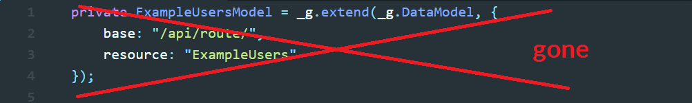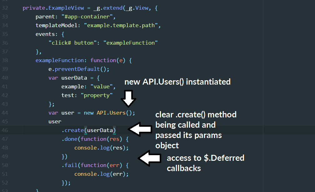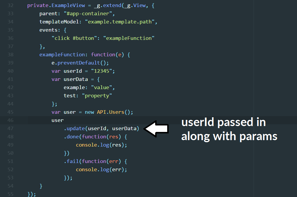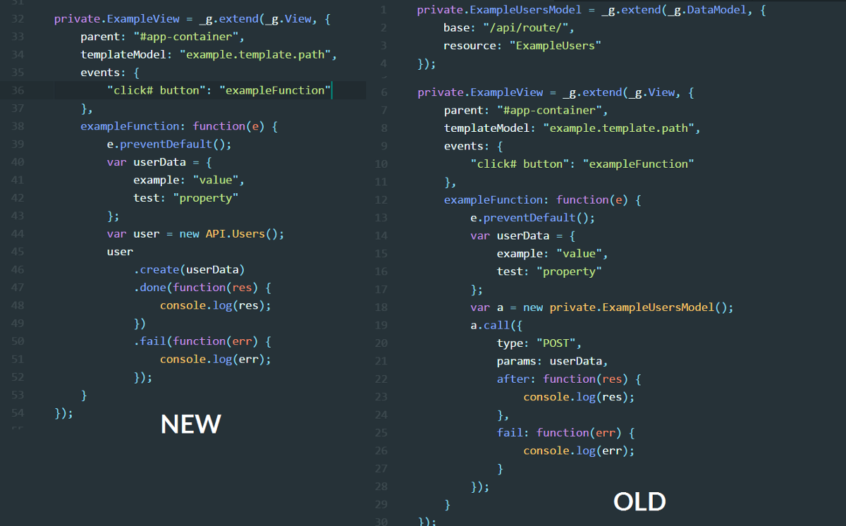 For this example, we will be using ‘Users’ as the model, and show how it was done before the SDK. First (above), a model is defined, and requires an API route to be defined with it. In this case: /api/route/ExampleUsers. Next, one of our Views is instantiated (you can ignore, or have a look at how it’s done, it’s not the focus of this post). Inside one of the event callbacks exampleFunction, the model is instantiated and we use the native Javascript function .call() to hit the API. We tell it that it is a POST, pass in our params, and sometimes pass in additions to the url.