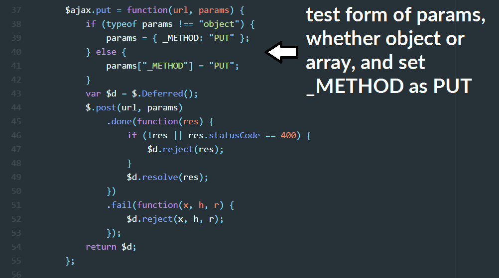 Defining the $ajax.post method is not our end goal, as notice that the returned object is self. Next we will start attaching to the self object, and use this post() method to begin cleaning up our API calls.