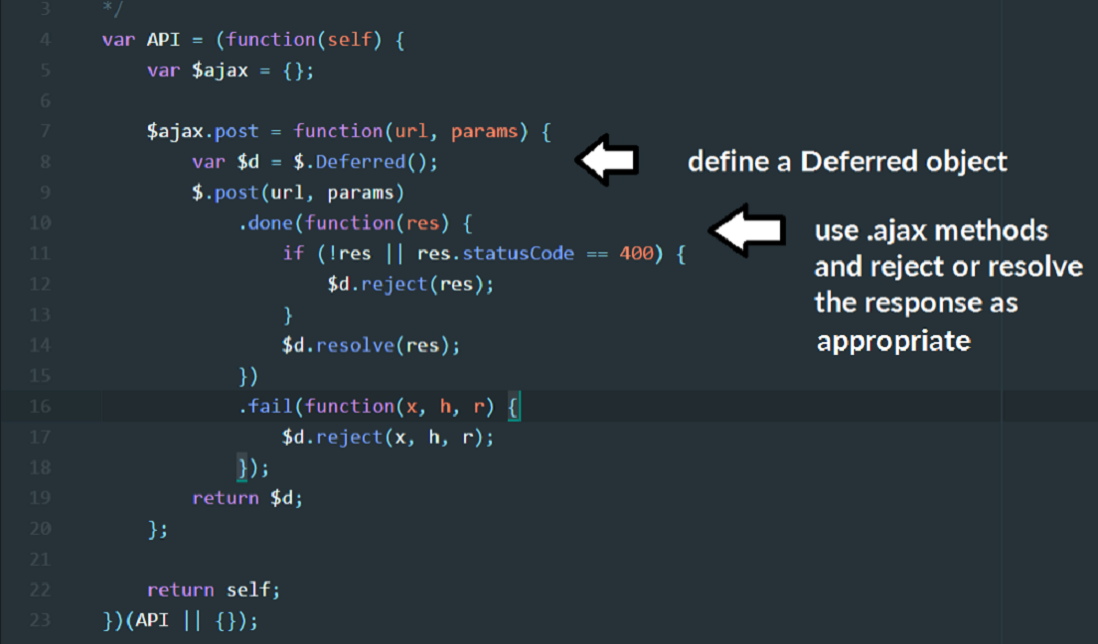The heart of this API are the jQuery [deferred](https://api.jquery.com/jQuery.Deferred/) object, and the [$.ajax](http://api.jquery.com/jQuery.ajax/) interface. We will define the API using an IIFE and return it out to the global scope. (This can be attached as a separate api.js file or bundled up with the rest of your code base using module.exports, which I won’t cover here). The basic pattern for this is similar to a jQuery plugin, shown here.