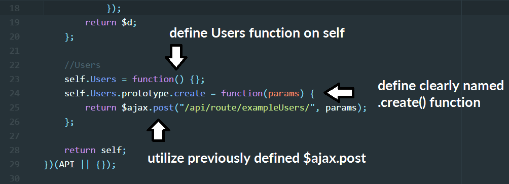 To begin defining a section for our API, we will attach a new Users function to self and attach a .create() function to the prototype of the Users function as shown below.