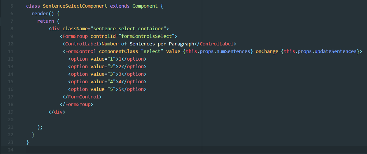 The select components are straightforward as well. They listen onChange for updating the state with their corresponding number of sentences/paragraphs.