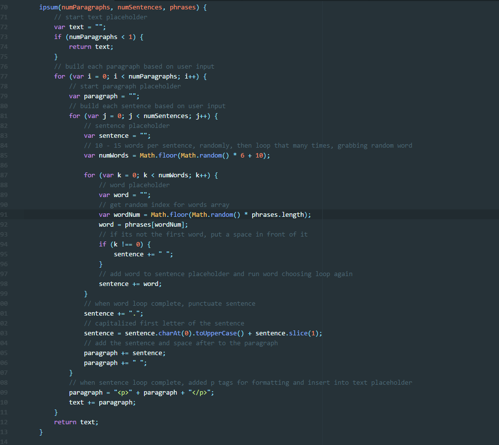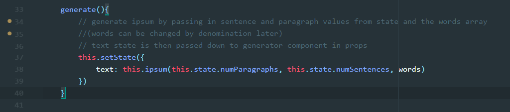 The ipsum is really the heart of a lorem ipsum generator, and several different techniques for creating lorem ipsum type text can be found online. The basic pattern for this case though is loop in a loop in a loop! Here is the generate method, and the ipsum method that it uses in setting state.