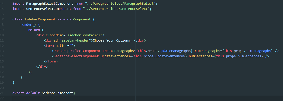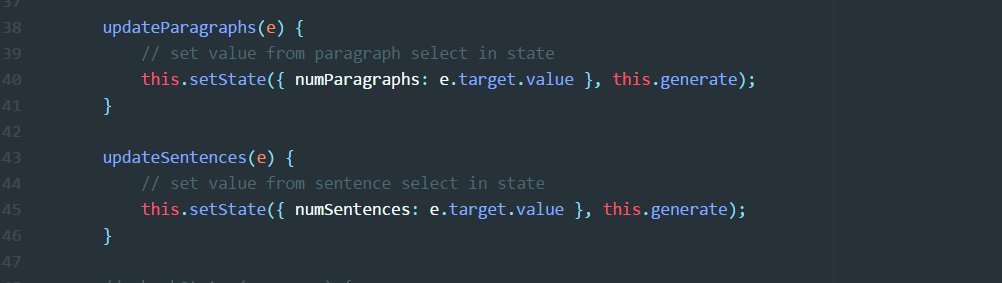 The two methods are nearly identical, updateSentences and updateParagraphs. They will take the value from a select option in the SideBar component, and set it into state.
