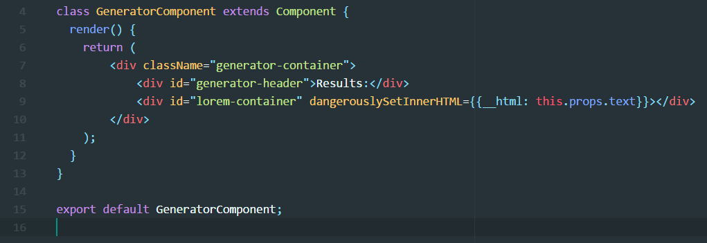 Last, is the Generator. It’s so simple that I debated showing it, but did want to touch on one aspect of it. The Generator receives the string of HTML generated by the ipsum method, and renders it to the container. Because it is receiving HTML, and not plain text, it requires using the ominously named dangerouslySetInnerHTML React prop. The reason this is dangerous involves someone inserting a \<script> tag in to this, and doing nefarious things. In my case however, the user is not using a text input, the App instead is providing the string, using only their number input values from selects. I feel fine about using it in this case. Otherwise, you would use a lifecycle method like componentDidUpdate. So, here’s what it looks like: