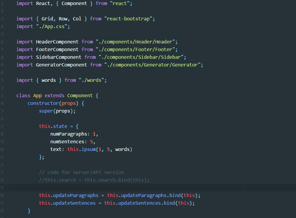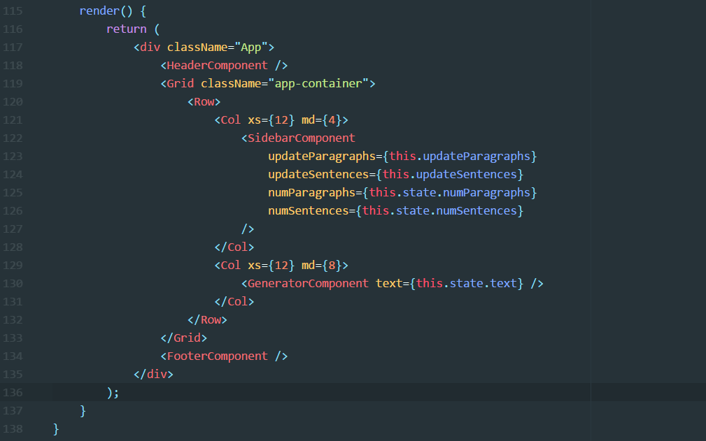 I’ll jump straight to the render() here to show the design and how our initial state will be rendered. We’ve got a SideBar, where two methods are being passed down, as well as the numParagraphs and numSentences. Most of the heavy lifting is done through this component. We’ve got the Generator component, which just takes text from the state and displays it.